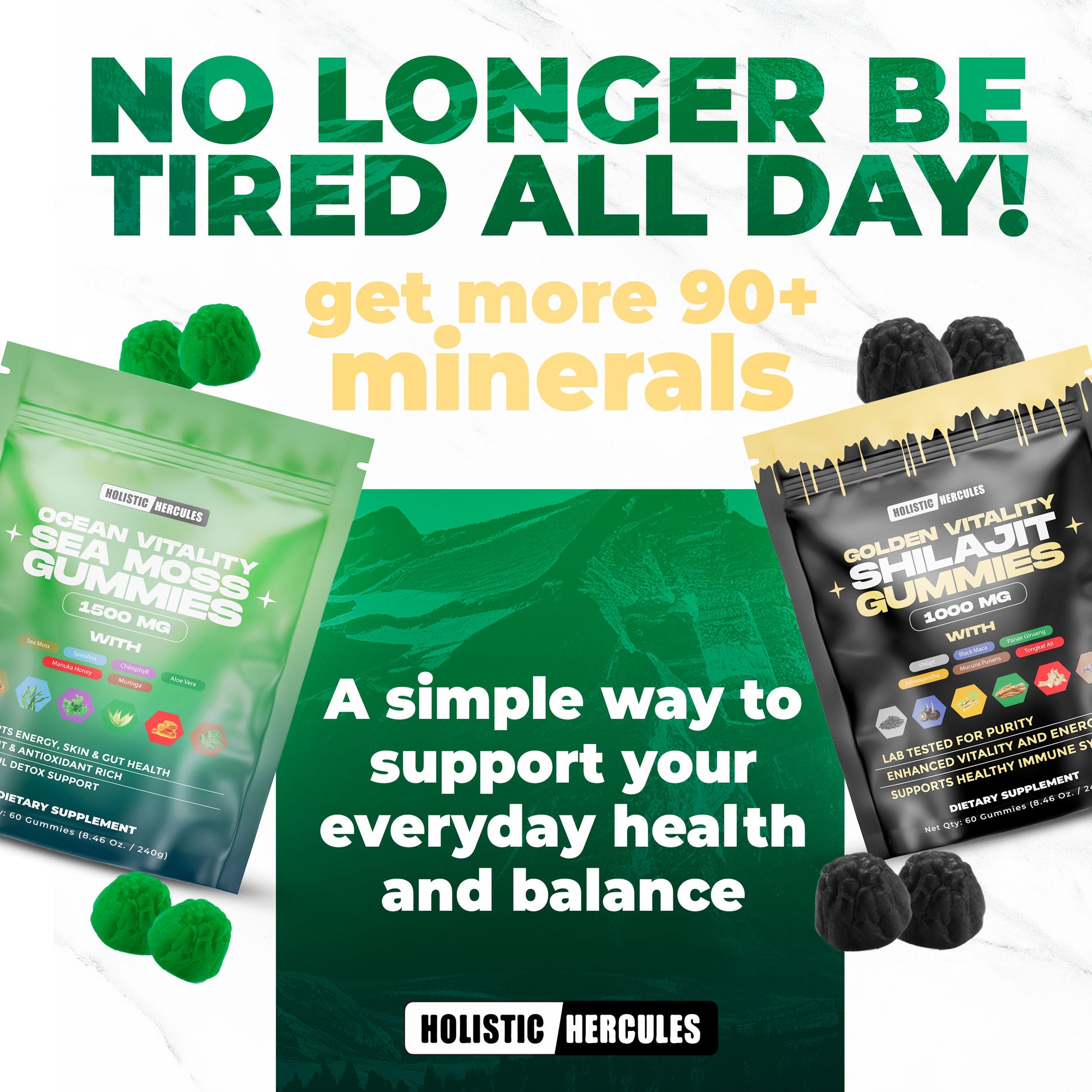 Introducing Holistic Hercules Sea Moss Gummies – your daily dose of vitality in a delicious, convenient gummy! Packed with 92 essential minerals, these sea moss gummies are designed to nourish your body from within. Each bite supports immune health, enhances skin clarity, and promotes natural energy. Our gummies are made with organic Irish sea moss, offering powerful benefits for digestion, thyroid support, and overall well-being.